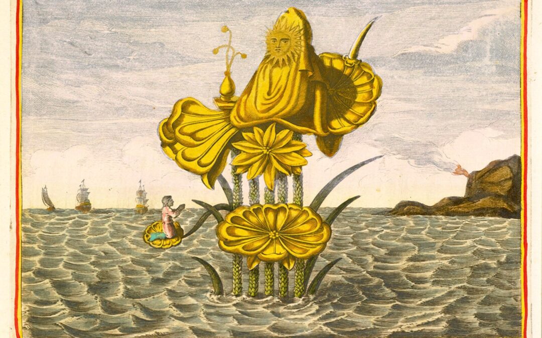 Sie sitzt auf einem Lotus, aufrecht, still. So zeigt sie ein Kupferstich aus dem 17. Jahrhundert. „Pussa“, schreibt der europäische Gelehrte darunter. Was wir sehen, ist ein Bild. Was wir erkennen, ist ein Missverständnis. Und vielleicht – eine Ahnung.