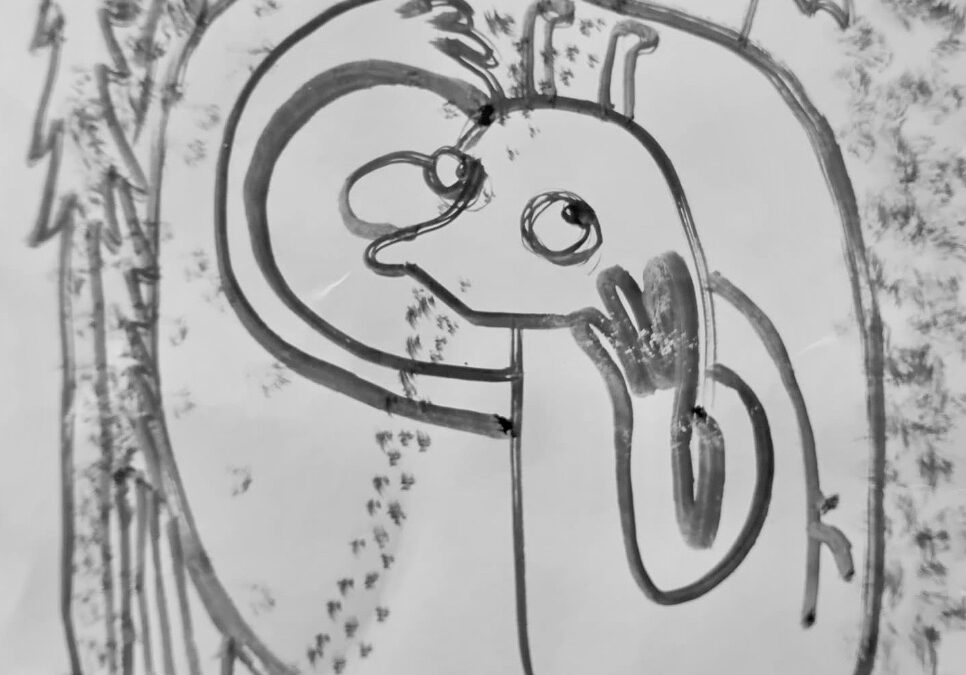 Ich arbeite an einer kleinen Geschichte über eine Nacktschnecke namens «Schlimak». Ein Bilderbuch. Der Text ist fast fertig, nun geht es an die ca. zehn Illustrationen. Meinen ersten Schlimak brachte ich mit Pinsel auf Papier. Danach machte ich mich an die Details der Geschichte.